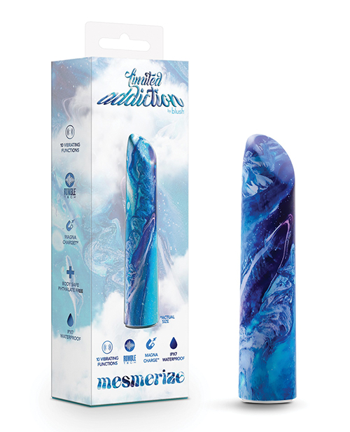 Are you ready for your newest addiction? The Limited Addiction Mesmerize Power Vibe is a colorful and sleek vibrator that delivers 10 deep, rumbly vibrations with the superior Rumble Tech motor! Cycle through 5 powerful speeds and 5 unique and thoughtfully curated patterns using the two button design to find your perfect pleasure preference. IPX7 submersible waterproof for bath and shower play and USB magnetic rechargeable, the Mesmerize Power Vibe is easy to clean and even easier to use. It has a smooth, sensual satin feel and it contains no phthalates, paraffins, latex, or fragrance.