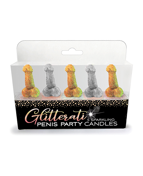 Add some sparkle to your special day with Glitterati Penis candles! Our set of five 2-inch penis candles is perfect for your bachelorette celebration. Each package contains two beautiful silver and three luxurious gold candles; you can add a touch of fun and sophistication to your decor. Plus, we have coordinating Glitterati penis balloons, plates, napkins, games, accessories, and more!