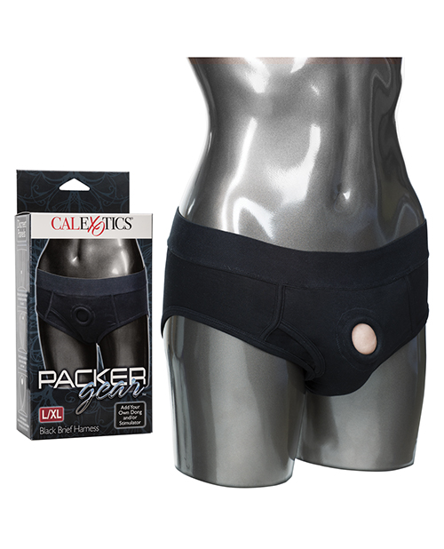 The comfortable and supportive Packer Gear Black Brief Harness is designed for the ultimate in style and comfort when fashioning your favorite stimulator. The hipster style brief has a fashionable masculine cut, and internal pockets to store your favorite vibrating stimulator. Slip on the briefs, insert a packer, probe or dong, and then enjoy intimate play.