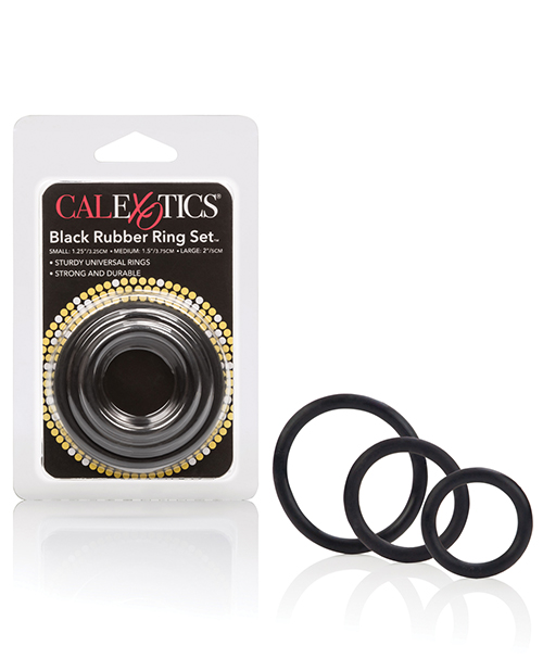 Enhance your erotic sensual satisfaction and performance with the sleek and discreet Rubber Ring Black 3 Piece Set. The trio of erection enhancers are easy to use, comfortable to wear, and great for instant arousal stimulation and gratification extension. The flexible rubber adornment rings are supplied in 3 different sizes and are designed to maximize your intimate, sensual encounters.